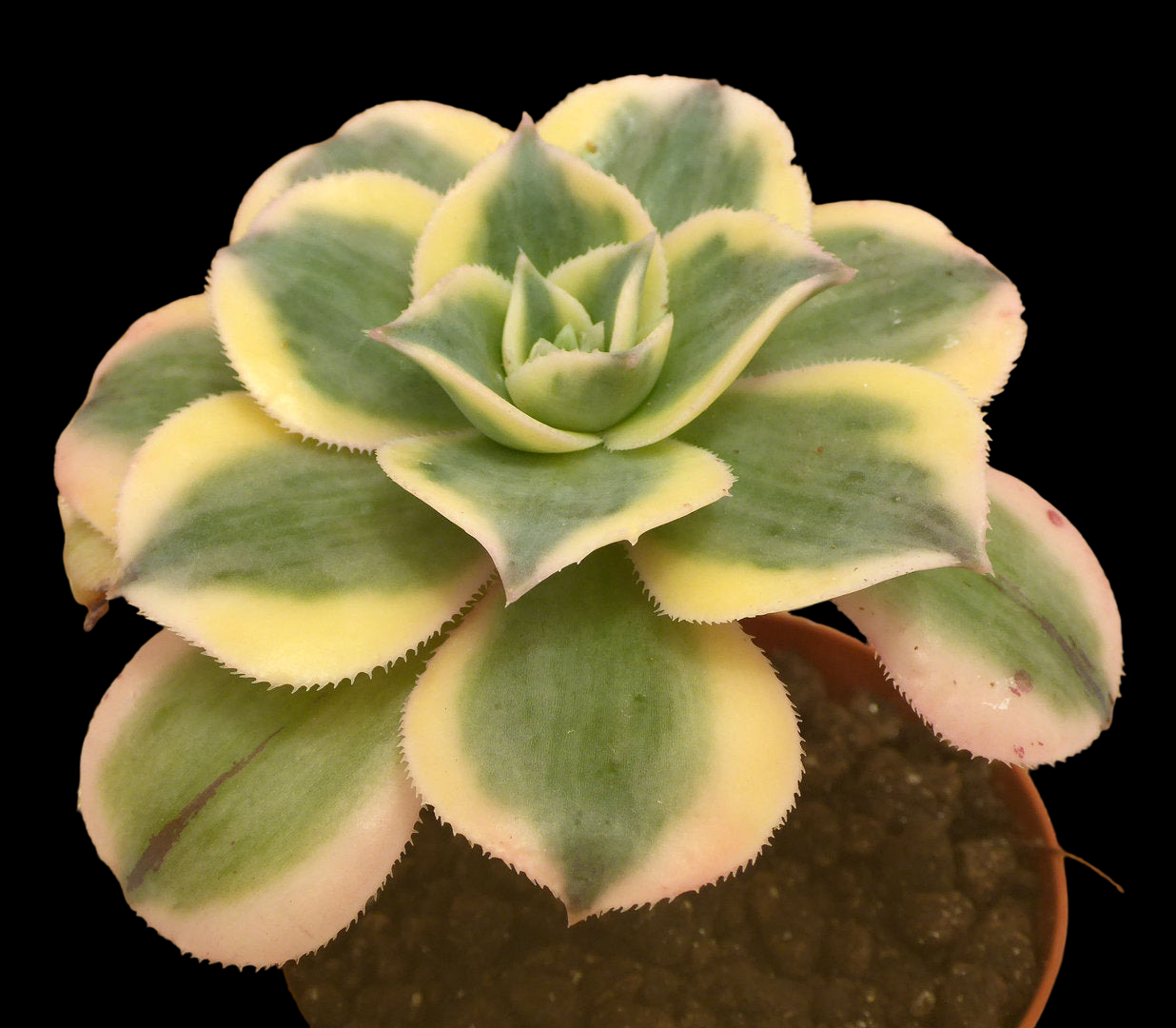 Aeonium cv. Sunburst est un cultivar d'Aeonium formant un buisson compact avec de grandes rosettes panachées. Cette variégation est particulière : certaines feuilles juvéniles sont presque totalement dépourvues de chlorophylle (jaune paille), tandis que la grande majorité des feuilles adultes sont striées par une large médiane verte.