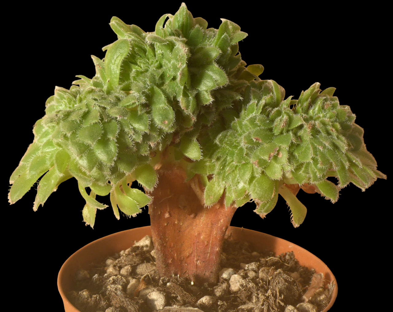 Contrairement à Aeonium tabuliforme (espèce type) qui est acaule (sans tige), la forme cristée pousse en petit buisson. La tige est surmontée d'une multitude de petites rosettes vert franc... Superbe !