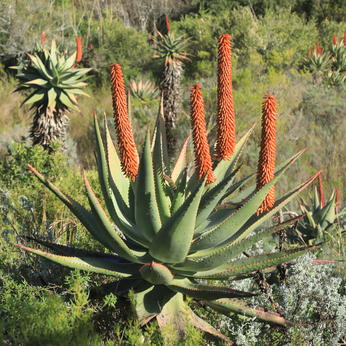 Aloe ferox est rustique sur le littoral méditerrannéen. Cet Aloe pousse sur une tige robuste qui peut atteindre 3 à 5m. La floraison illumine le jardin en Janvier et février par de beaux épis rouge orangé.