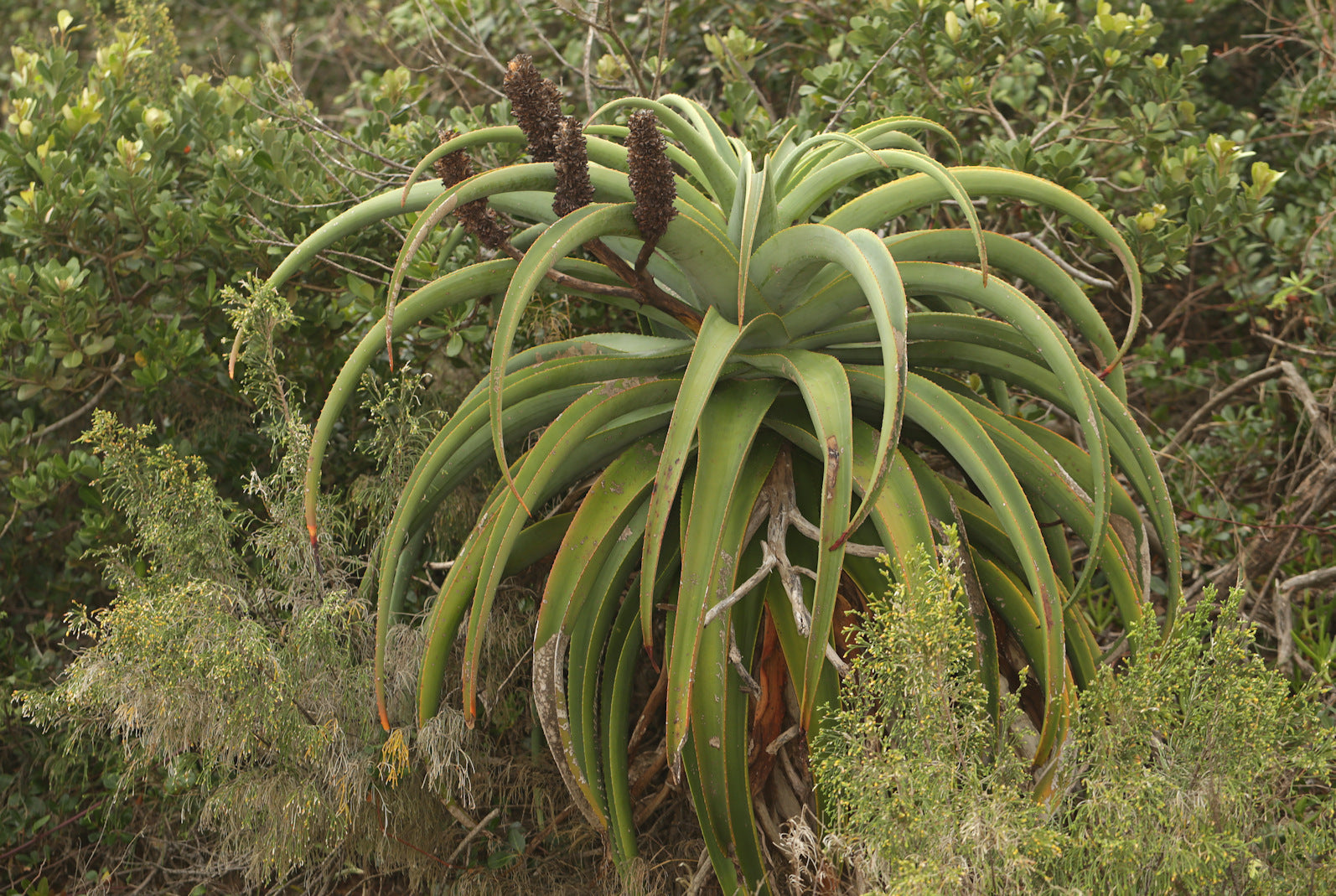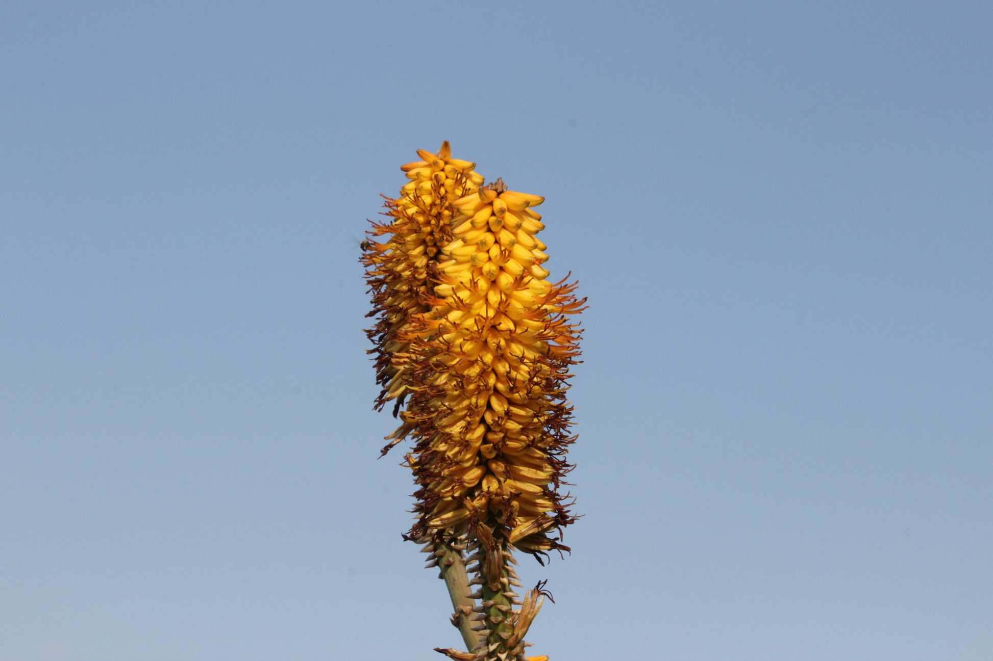 Aloe thraskii est un Aloe de bord de mer poussant dans le sable preque pur. Il peut atteindre 3m de haut et forme de grandes hampes florales ramifiées dans les tons oranges virant au jaune pâle.