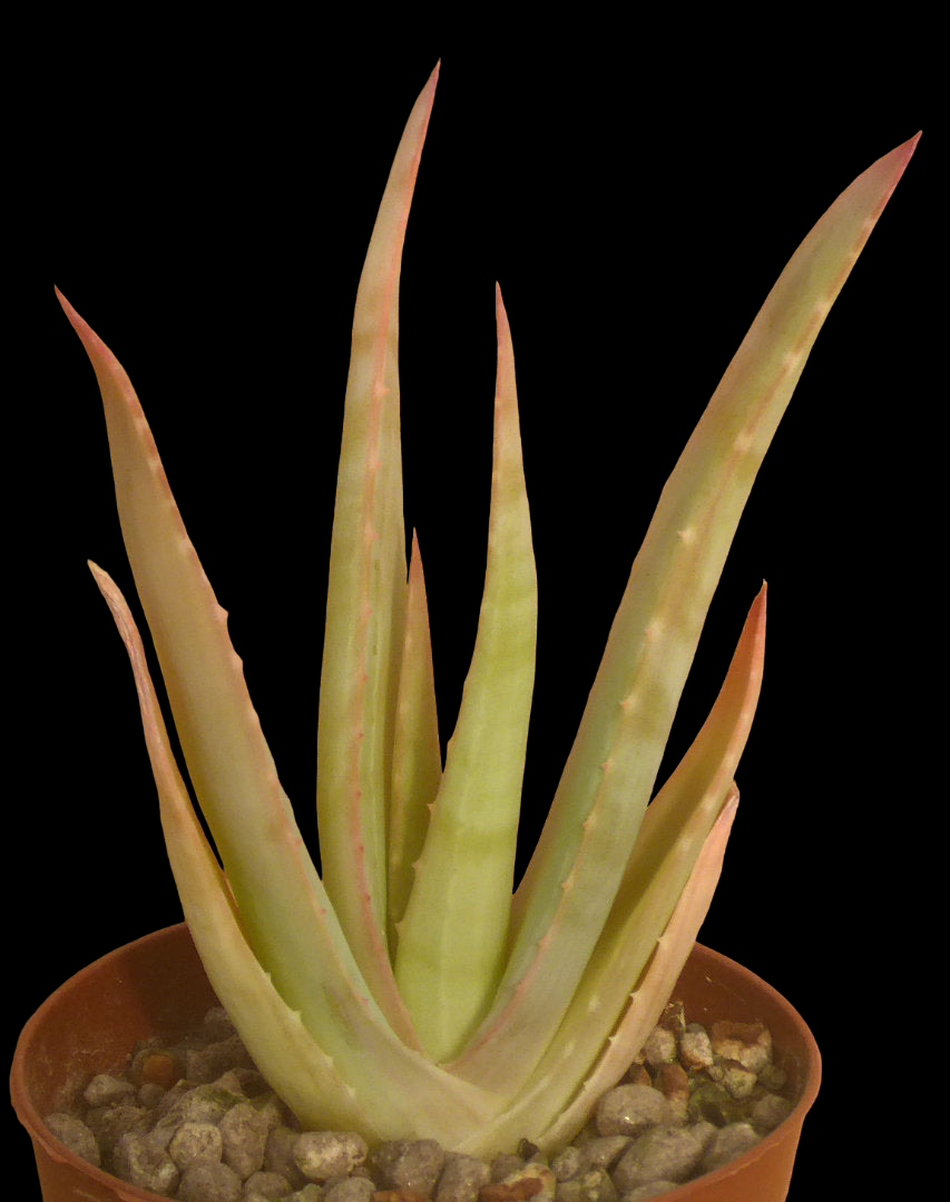 Aloe trigonantha est rarement proposé en culture. Il pousse dans les prairies dans une toute petite aire entre 2.100 et 2.500 m d'altitude. Aloe trigonantha est un Aloe acaule formant une rosette dense de feuilles vertes pale et marginées d'un liseret rose. Lafloraison en épi est rouge brillant à orange.