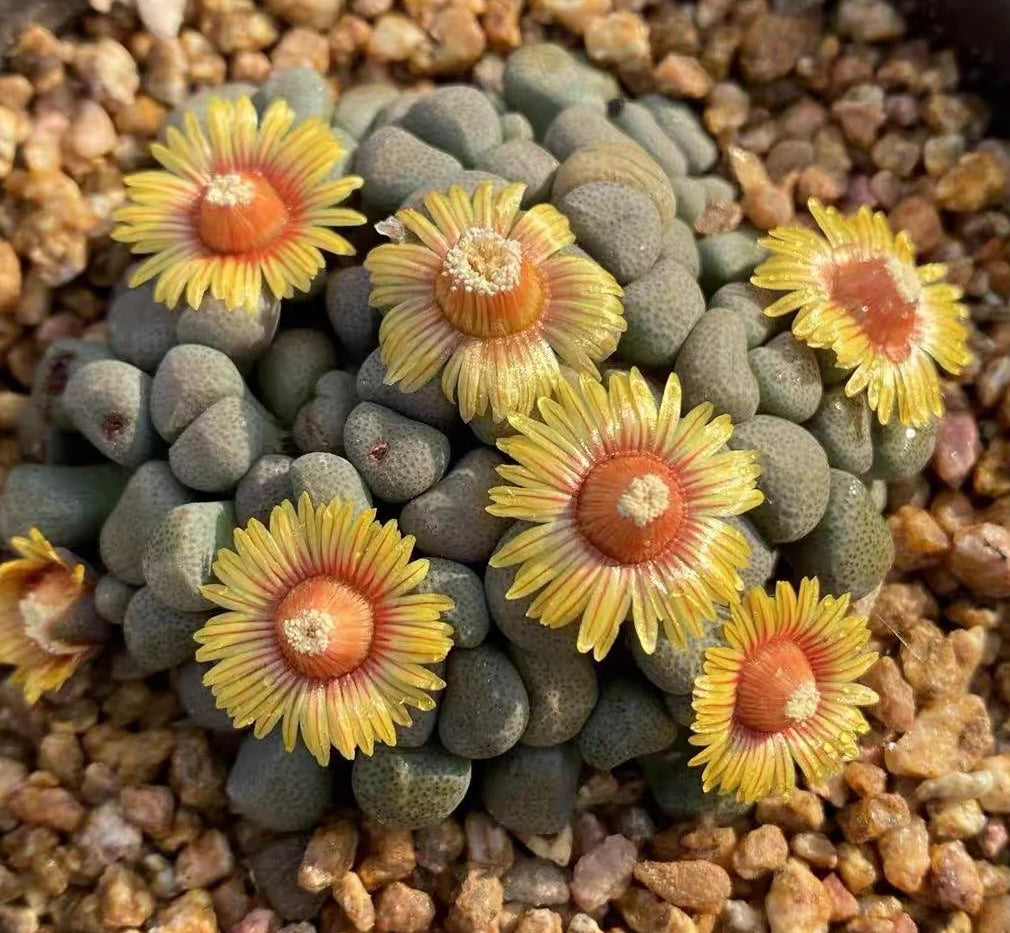 Aloinopsis schooneesii est une petite Aizoacée naine et dotée d'un rhizome tubéreux assez important. Ses fleurs peuvent atteindre 1,5 cm de diamètre. Elle sont jaunes à rayures rouge.
