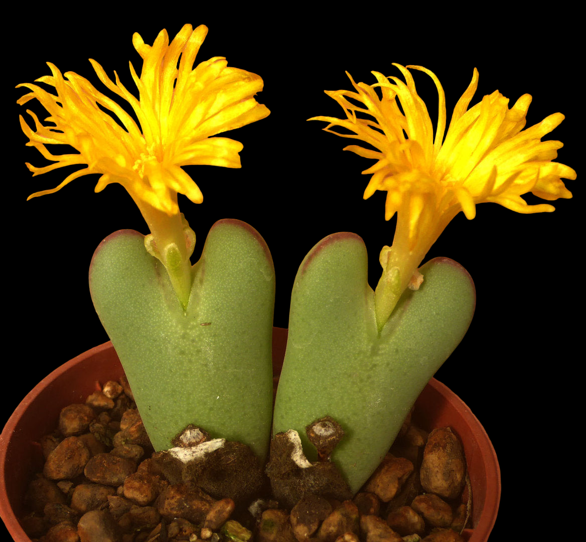 Conophytum bilobum ssp. cordatum presente un joli feuillage glauque en forme de coeur (cordatum). La floraison est jaune.
