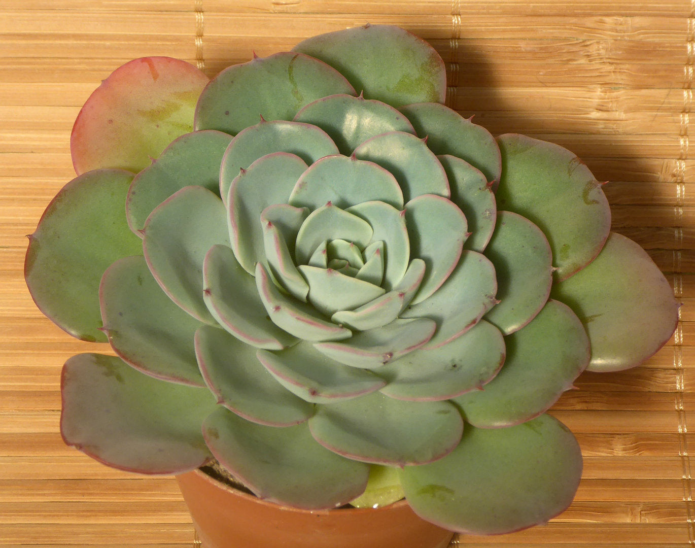 Echeveria cv. Atlantis est un bel hybride créé par Renee O'Connell. Elle forme une grosse rosette aux feuilles charnues. La floraison est orangée.