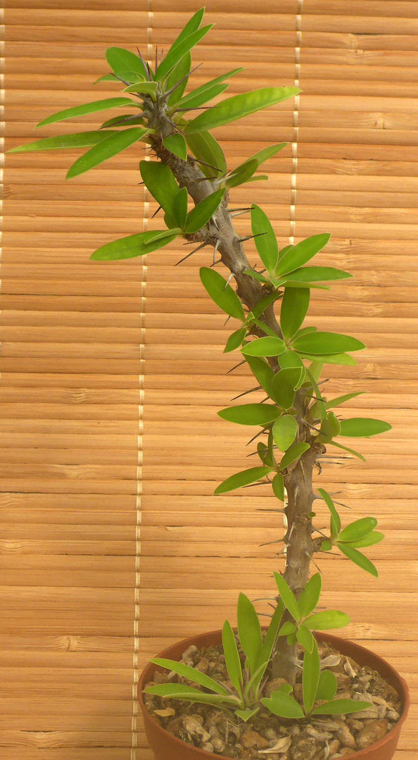 Euphorbia milii var. tananarivae a été décrite initialement par Leandri sous le nom d' Euphorbia splendens var. Tananarive. Elle forme un petit arbuste très ramifié qui se couvre de petites fleurs jaunes pâles. Très gracieux !