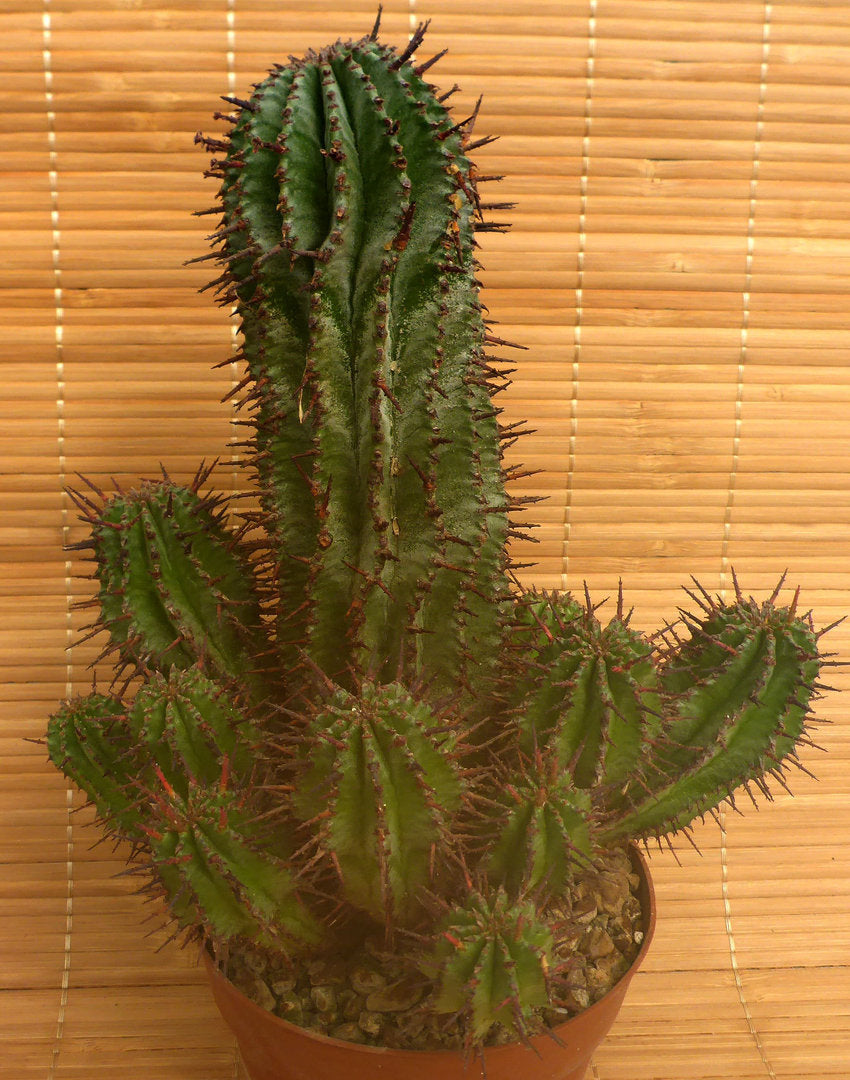 Cette variété d' Euphorbia polygona a pour particularité d'avoir des tiges qui se contortionnent et vrillent quand celles-ci ont atteint une belle taille. Les côtes dessinent alors des "zig-zag" curieux et attrayant.