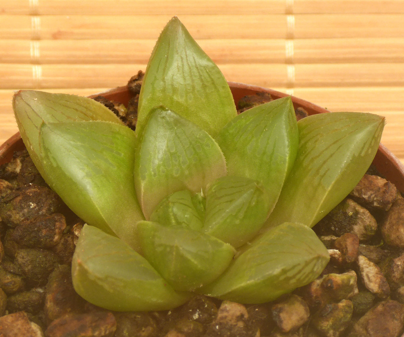 Haworthia springbockvlakensis x Haworthia cymbiformis n'a pas été nommé, mais cet hybride est de toute beauté avec son feuillage turgescent et légèrement strié.
