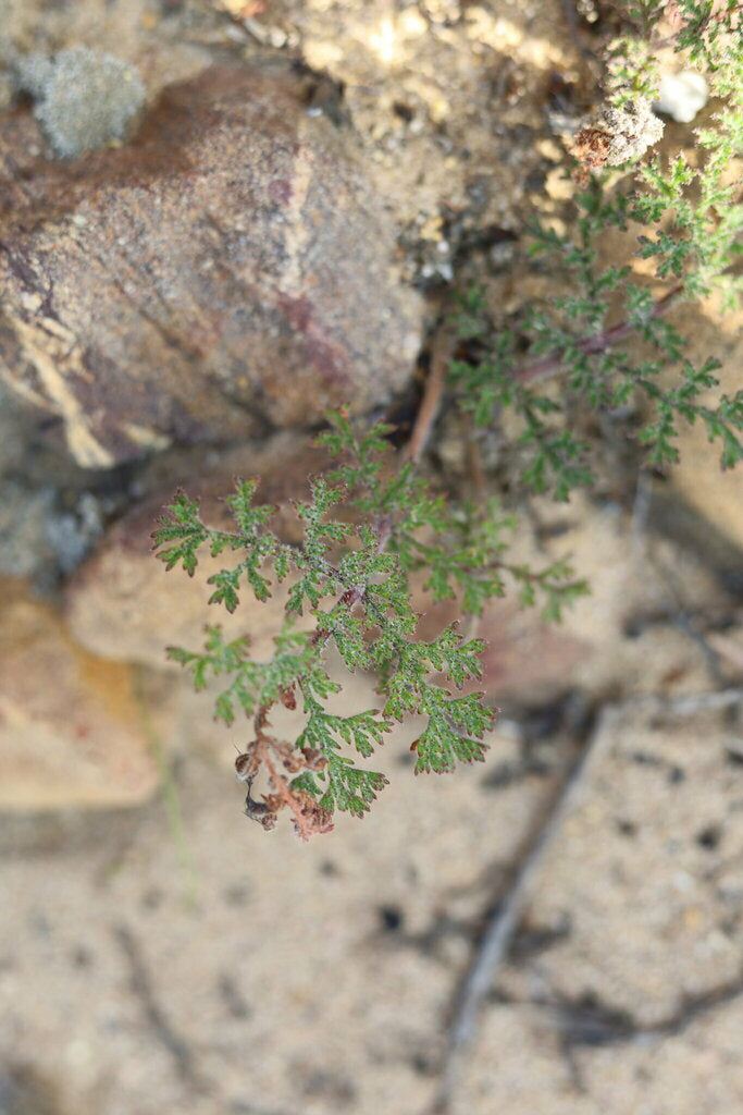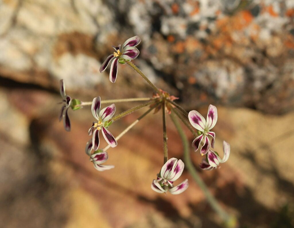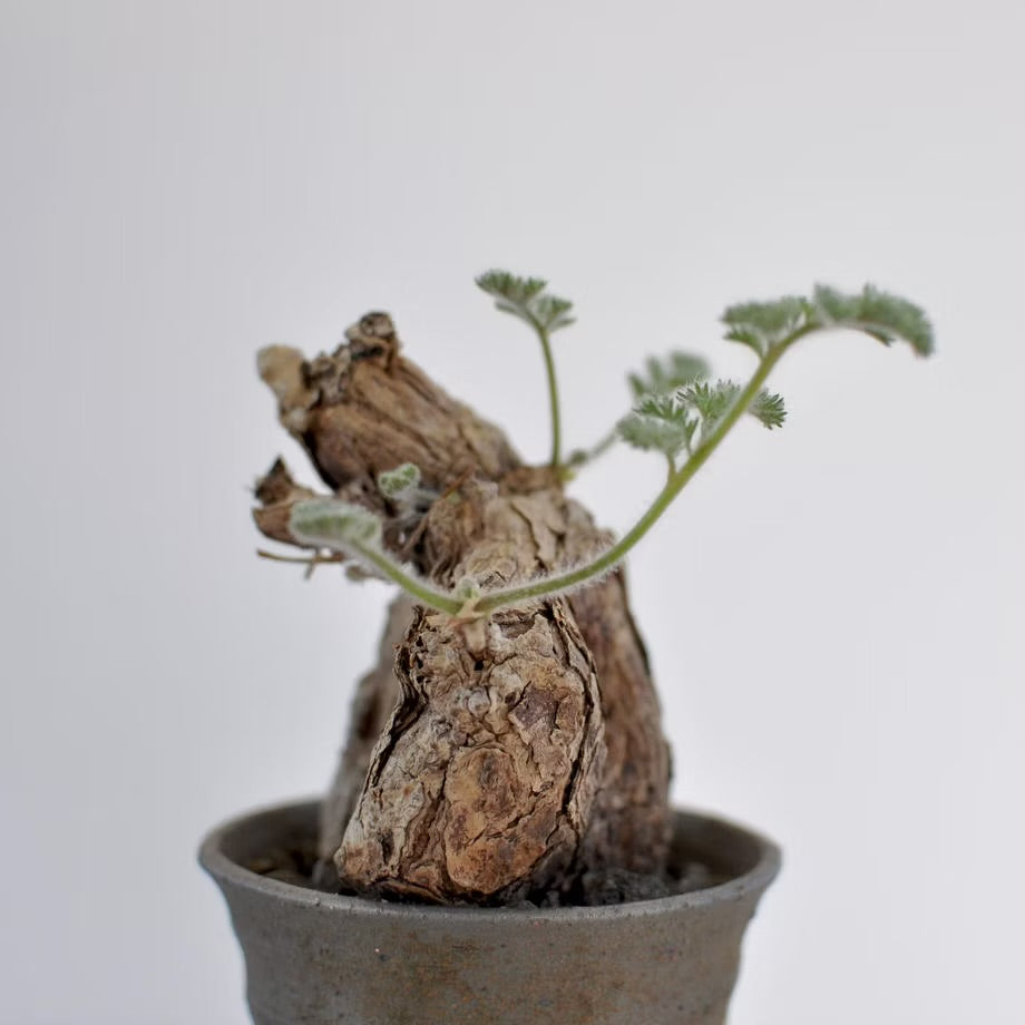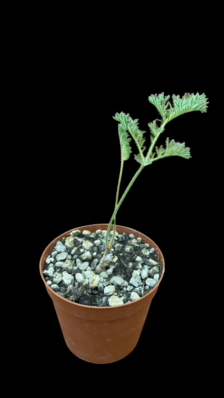 Pelargonium triste est une espèce géophyte singulière, qui développe un remarquable caudex. A dormance estivale, les feuilles peuvent atteindre 25cm de long, parfois 50. Ses feuilles font penser à celles de la carotte, avec une forte pilosité. Les fleurs sont de couleurs crèmes avec des rayures roses ternes et parfumées la nuit.